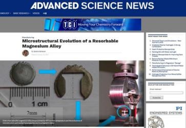 刘德学副教授课题组发表在《先进工程材料》(Avanced Engineering Materials)杂志上关于生物医用镁合金经过高压旋钮强塑性变形后的研究成果,被Advanced Science News.com遴选为焦点论文进行重点报道。该研究成果研究了在室温条件下,克服镁合金固有的塑性差的成形特点,通过控制高压旋钮工艺参数,成功制备了超细晶镁合金试样;运用自主设计的微拉伸试验机测试了非标准合金试样的生物医用力学性能;通过透射电镜等设备深入研究了合金的微观组织演变,揭示了合金的强化机理,并解析了超细晶-耐蚀-强化机理。