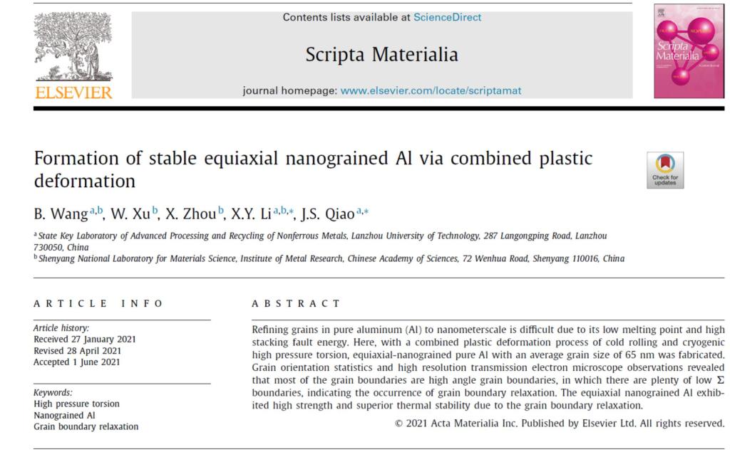 日前,兰州理工大学省部共建有色金属先进加工与再利用国家重点实验室与中科院金属所沈阳材料科学国家研究中心研究团队通过采用冷轧与低温高压扭转组合大塑性变形工艺,成功制备了热机性能稳定的纯铝纳米晶体。该材料平均晶粒尺度约为65nm,硬度为840MPa,塑性变形诱导晶界发生弛豫使材料具有良好的热机稳定性能,试验证明加热至200℃(高于再结晶温度)该等轴纳米晶体仍然保持稳定。相关研究论文以题为 “Formation of stable equiaxial nanograined Al via combined plastic deformation” 发表在国际材料科学领域TOP期刊《Scripta Materialia》 上。第一作者为兰州理工大学硕士生王兵,通讯作者为国家重点实验室乔及森教授和我校柔性引进专家李秀艳研究员。