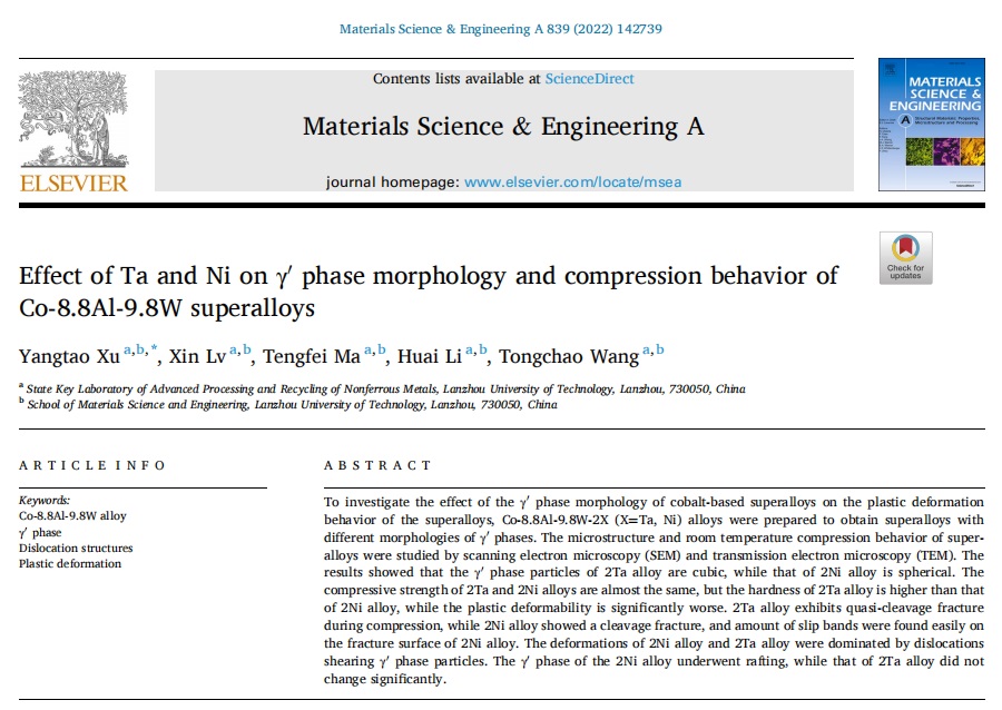 2022年2月,省部共建有⾊⾦属先进加⼯与再利⽤国家重点实验室和材料科学与⼯程学院徐仰涛教授团队的最新科研成果以题为《Effect of Ta and Ni on γ′ phase morphology and compression behavior of Co-8.8Al-9.8W superalloys》在国际材料科学领域的SCI中科院一区期刊Materials Science & Engineering A(影响因⼦5.234)在线发表。该项研究⼯作主要由省部共建国家重点实验室完成,论⽂主要完成人为兰州理工大学硕士研究生吕鑫,第一作者和通讯作者为徐仰涛教授。论文连接:https://doi.org/10.1016/j.msea.2022.142739