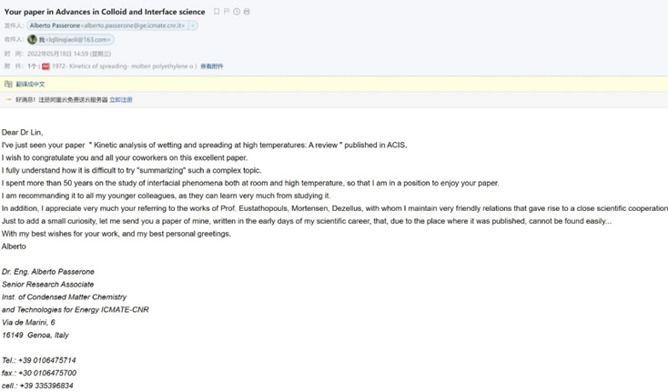 论文刚online不久就收到了来自意大利能源凝聚态化学与技术研究所Passerone教授的关注与肯定,信件原文如下:
