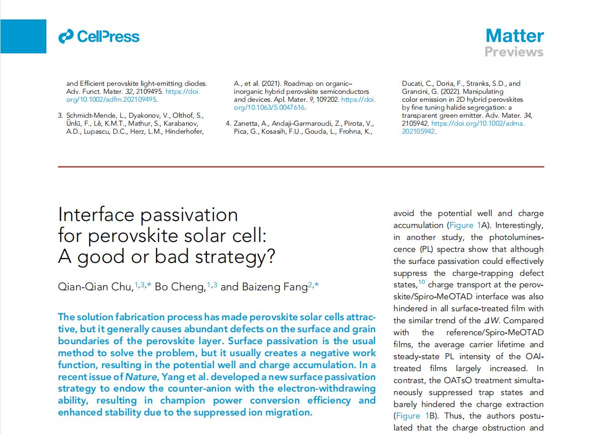2022年8月,省部共建有色金属先进加工与再利用国家重点实验室和材料科学与工程学院楚倩倩、成波博士等以“Interface passivation for perovskite solar cell: A good or bad strategy?”为题,在中科院一区期刊《Matter》(IF=19.967)上发表钙钛矿光伏领域发表重要评述论文。《Matter》是《Cell》期刊的姊妹刊,是材料、化学类享有盛誉的国际权威期刊。
