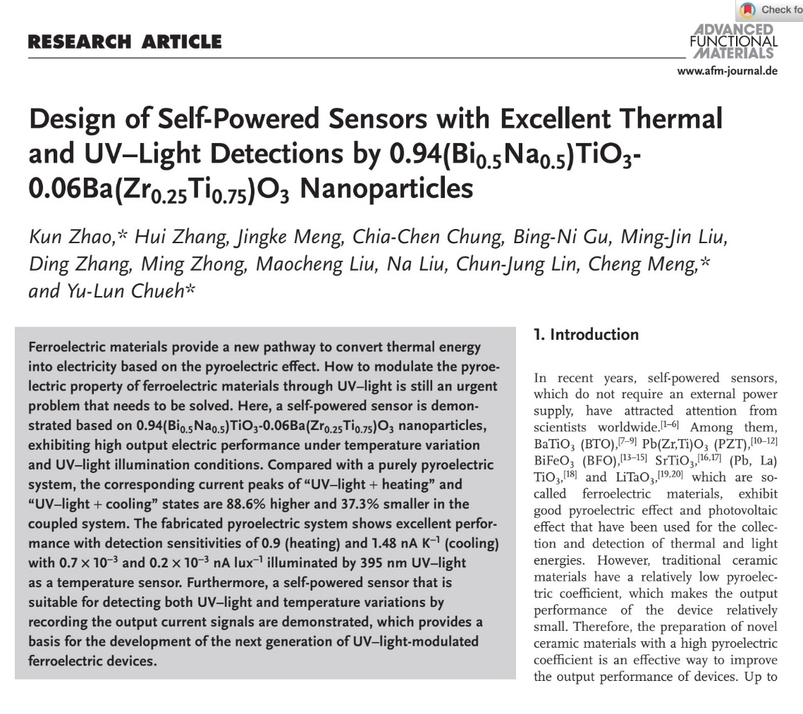 近日,省部共建有色金属先进加工与再利用国家重点实验室能源材料团队赵坤副研究员等人在自驱动传感器领域取得最新研究进展,并以题“Design of Self-powered Sensors with Excellent Thermal and Ultraviolet (UV) Light Detections By 0.94(Bi0.5Na0.5)TiO3-0.06Ba(Zr0.25Ti0.75)O3 (BNT-BZT) Nanoparticles”发表在国际材料领域顶级期刊Advanced Functional Materials (IF:19.924,中科院一区)上,兰州理工大学省部共建有色金属先进加工与再利用国家重点实验室为第一完成单位,赵坤副研究员为第一作者和通讯作者,我校客座教授台湾新竹清华大学阙郁伦教授为共同通讯作者。