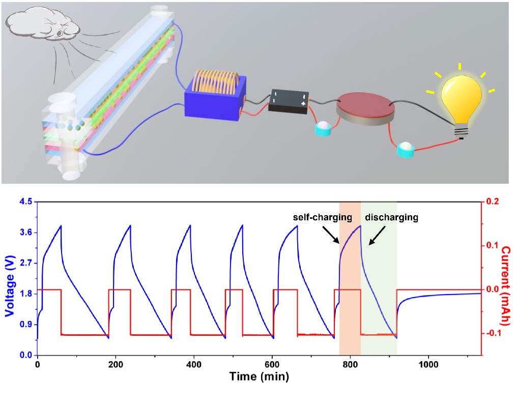 本文以具有高摩擦表面电荷密度的0.94(Bi0.5Na0.5)TiO3-0.06Ba(Zr0.25Ti0.75)O3/PVDF复合材料和PA作为匹配摩擦电材料构建了收集风能摩擦纳米发电机。当风速为20.6 m/s时摩擦纳米发电机开路电压和短路电流分别高达405 V和47 μA,最大输出功率为10.65 mW。并以LiNiMnCoO2为正极、NiCo2S4为负极以及Li7La3Zr2O12/ PVDF-HFP为固态电解质设计的全固态锂离子电池在200次循环后可以保持51.3 μAh的放电容量,库仑效率为98.5%。使用摩擦纳米发电机可在58 min内将制备的全固态锂离子电池电压从0.5 V充至3.8 V。构建的自充电系统可驱动12个并联的白色发光二极管连续工作42 min,且可以驱动商业pH计工作5 s。此项工作为低成本、高性能和高安全性自充电系统的开发及其在新型自驱动微电子器件中的大范围应用提供了参考方案。