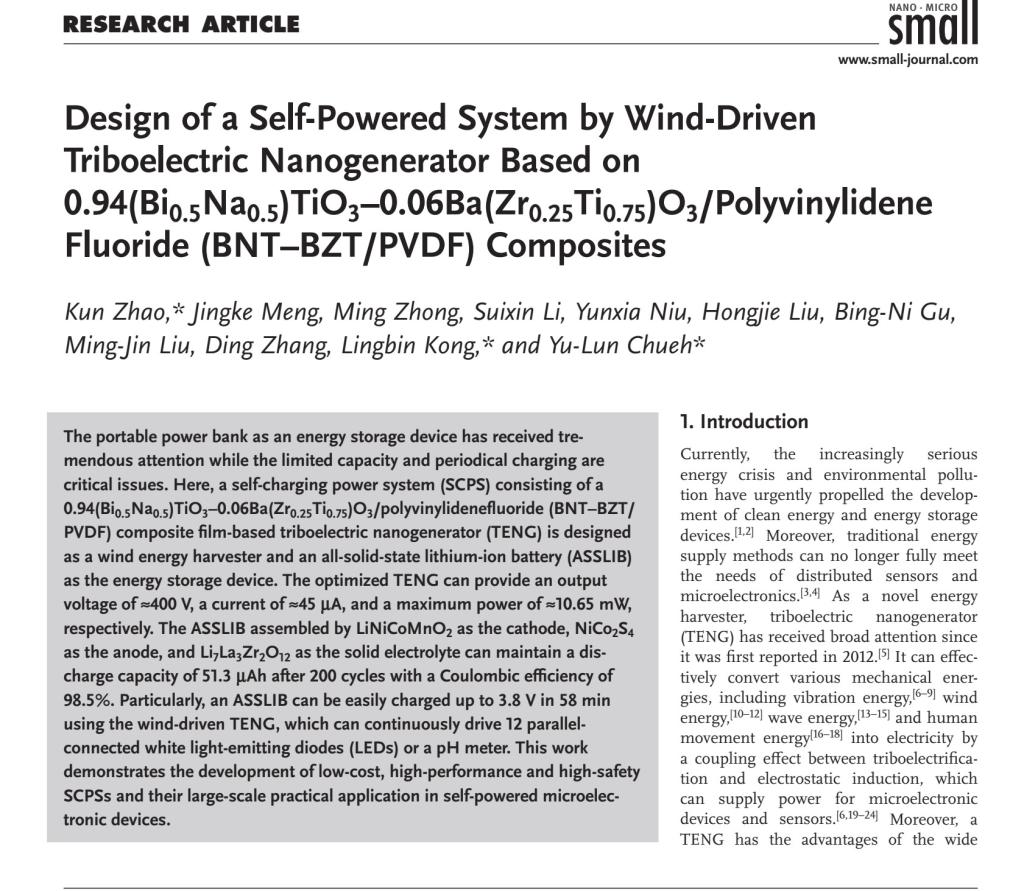 近日,省部共建有色金属先进加工与再利用国家重点实验室赵坤副研究员等人在自驱动系统领域取得最新研究进展,并以题“Design of Self-powered System By Wind-Driven Triboelectric Nanogenerator Based on 0.94(Bi0.5Na0.5)TiO3-0.06Ba(Zr0.25Ti0.75)O3/polyvinylidene fluoride (BNT-BZT/PVDF) Composites” 在线发表在国际纳米、材料领域顶级期刊Small (IF:15.153 /Q1)上。兰州理工大学省部共建有色金属先进加工与再利用国家重点实验室为第一完成单位,赵坤副研究员为第一作者和通讯作者,材料学院孔令斌教授和我校客座教授台湾清华大学阙郁伦教授为共同通讯作者。