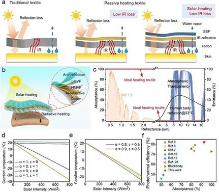兰州理工大学国家重点实验室喇培清教授团队和中国科学院兰州化学物理研究所清洁能源化学与材料实验室高祥虎研究员、刘刚研究员团队合作,通过一步磁控溅射方法在普通棉布表面制备了基于高熵氮化物(ZrNbMo-Al-N)的多层薄膜,具有优异的光热转化效率(82.2%,600 W m−2,0°C),实现了较高光谱选择性的人体热管理织物。通过建立稳态传热模型发现织物高吸收率和低发射率对人体在低温环境下保温都有贡献,特别是吸收率的优化,能够有效增加在户外光照环境下的保温能力。