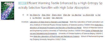 研究成果以“Efficient Warming Textile Enhanced by a High-Entropy Spectrally Selective Nanofilm with High Solar Absorption”为题发表于国际顶级期刊《Advanced Science》上(https://doi.org/10.1002/advs.202204817)。兰州化物所为第一完成单位,何成玉博士生和赵鹏硕士生为该论文共同第一作者,高祥虎研究员、兰州理工大学国家重点实验室喇培清教授、浙江大学李洋博士为共同通讯作者。(撰稿:喇培清 审核:石玗)