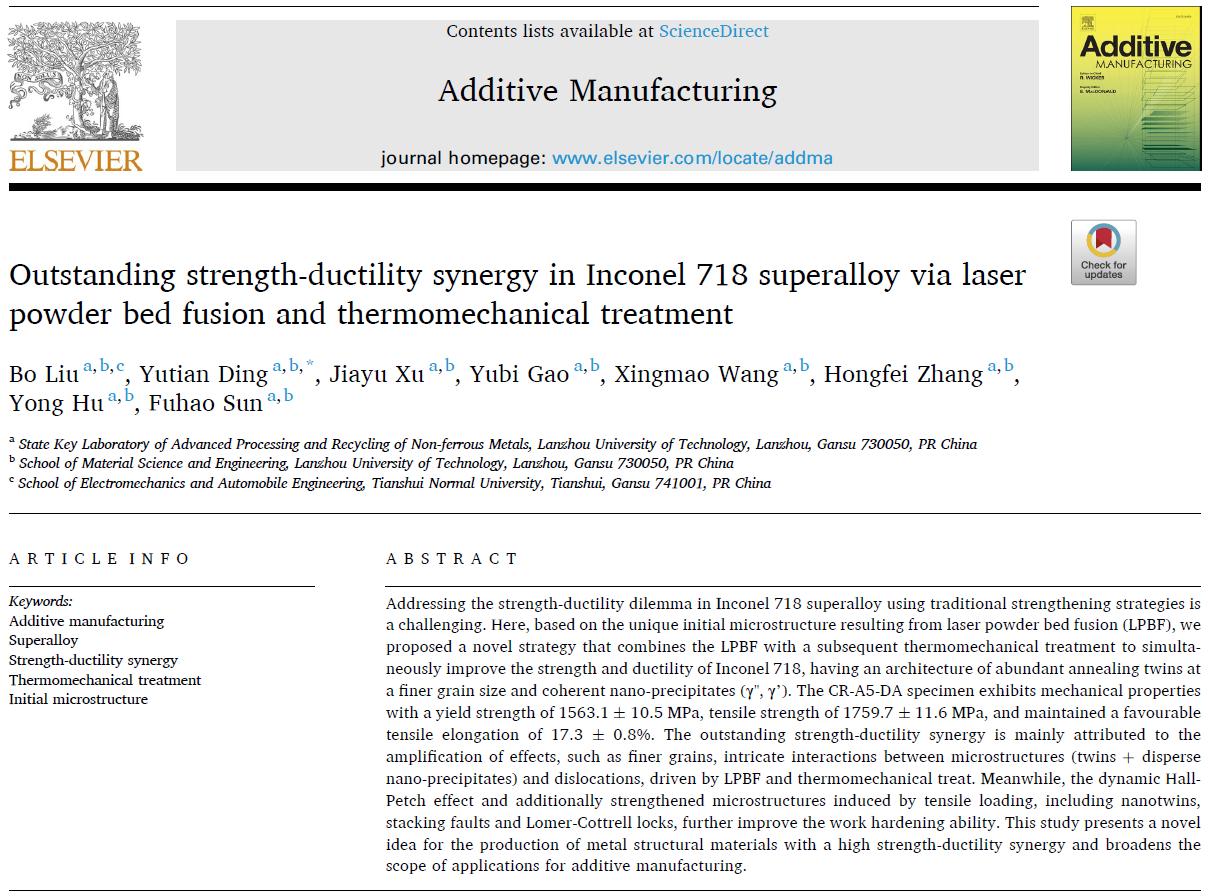近期,省部共建有色金属先进加工与再利用国家重点实验室丁雨田教授科研团队在激光增材制造镍基高温合金的孪晶界面调控研究中取得重要进展,研究成果以“Outstanding strength-ductility synergy in Inconel 718 superalloy via laser powder bed fusion and thermomechanical treatment”为题发表在国际工程技术领域TOP期刊《Additive Manufacturing》(IF:11.632/Q1)上(https://doi.org/10.1016/j.addma.2023.103491)。兰州理工大学省部共建有色金属先进加工与再利用国家重点实验室为第一完成单位,合作单位为天水师范学院机电与汽车工程学院和镍钴资源综合利用国家重点实验室;刘博博士为第一作者,丁雨田教授为通讯作者。