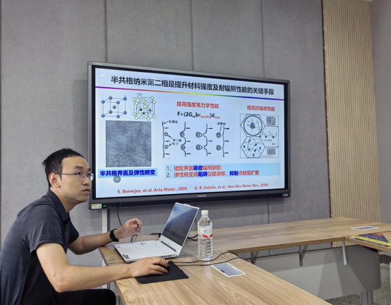 会上,蒋虽合作了题为“共格析出:金属材料耐辐照和机械性能一体化提升的新方向”的学术报告。报告从超高强材料和抗辐照材料的应用背景出发,介绍了半共格纳米第二相强化策略在高强钢和先进抗辐照材料开发中的发展现状。提出了半共格析出辐照稳定性及吸收缺陷效率不足、半共格析出强化和韧化所需的组织存在固有冲突和强韧性及抗辐照难以兼容三个关键问题,进而引出了利用全共格析出解决上述问题的新思想。介绍了共格析出强化理念在超高强马氏体时效钢和新型抗辐照材料中的应用案例,阐述了纳米析出相的有序强化效应、可变形强有序析出与预留位错间的协同效应、短程应力增强下的三维化平面滑移模式、共格有序析出在辐照效应下的快速回溶、较宽温度范围内的极快析出、高熵与动态有序无序转变双重效应消除纳米尺度偏析的耦合效应和局域相变促进辐照点缺陷原位湮灭等机理。