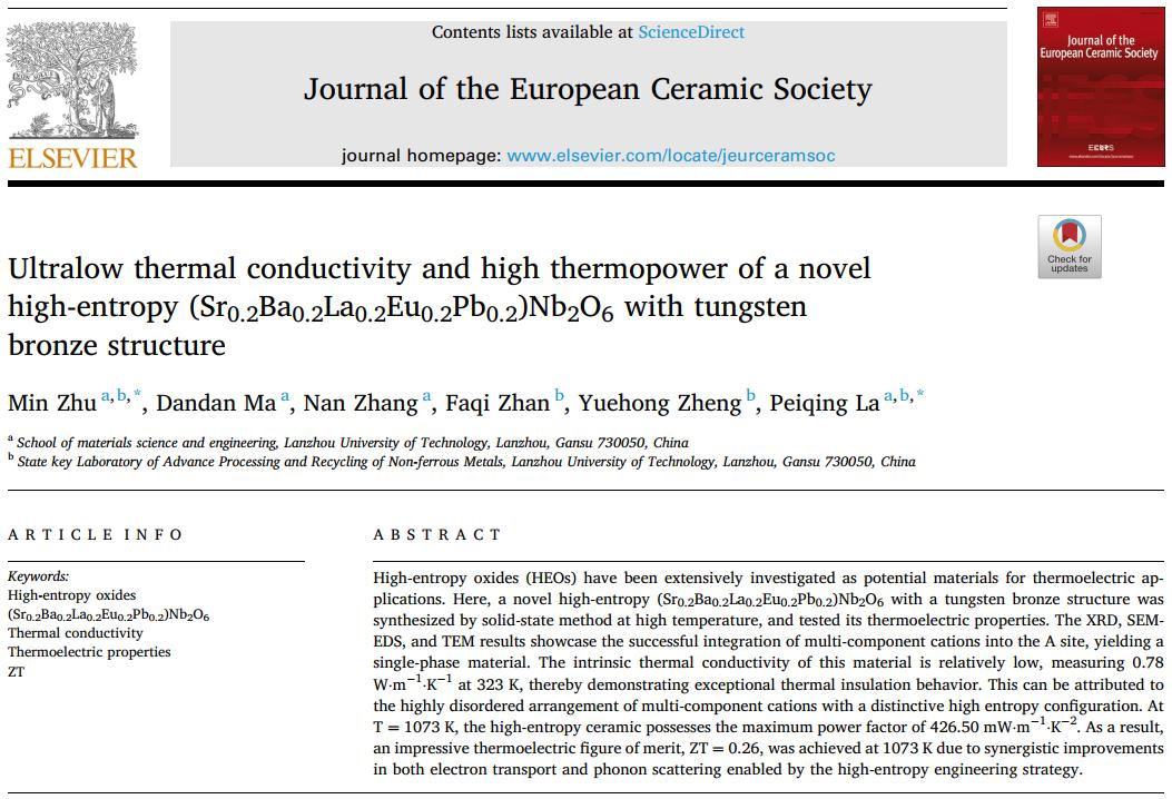 近期,省部共建有色金属先进加工与再利用国家重点实验室苛刻环境用不锈钢和高温合金设计与制造研究团队喇培清教授、朱敏副教授联合在陶瓷领域顶刊<Journal of the European Ceramic Society>(中科院1区,Top)发表了题为“Ultralow thermal conductivity and high thermopower of a novel high-entropy (Sr0.2Ba0.2La0.2Eu0.2Pb0.2)Nb2O6 with tungsten bronze structure”的论文。朱敏副教授和喇培清教授为共同通讯作者,研究生马丹丹为第二作者。