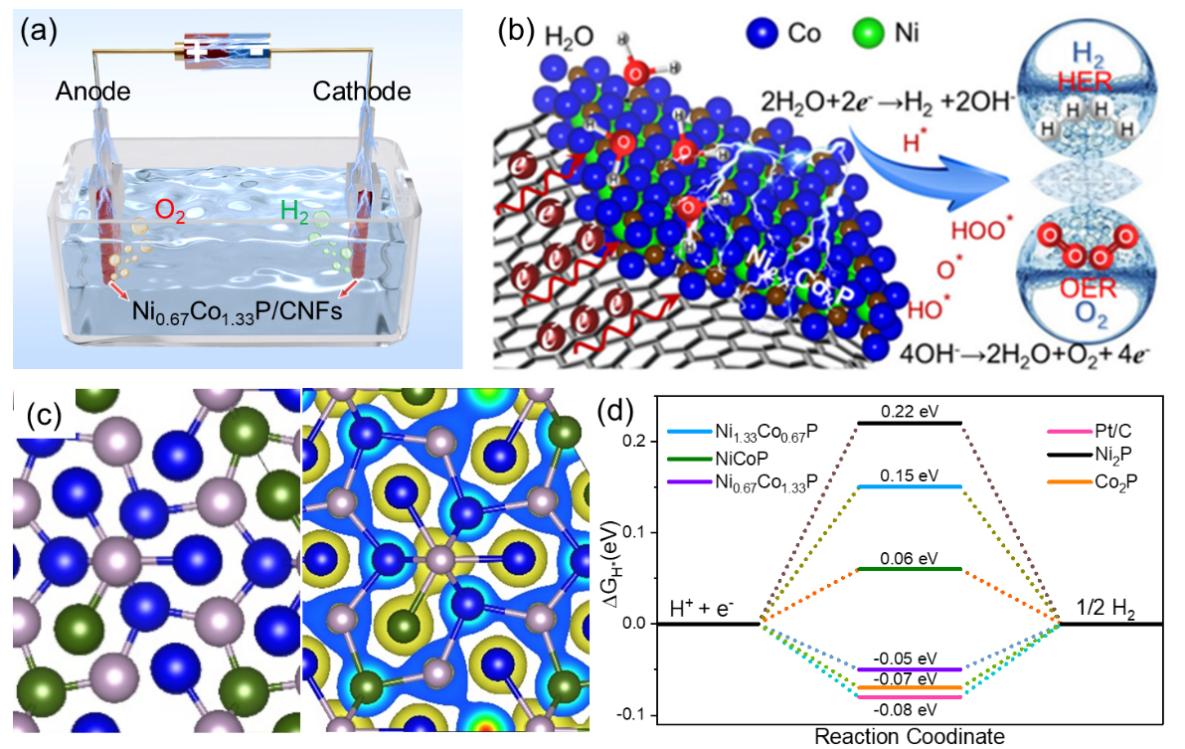 氢能作为理想的二次能源载体受到了广泛的关注,开发绿色高效的制氢工艺被认为是替代传统化石能源的核心问题之一。电催化电解水制氢因其能无污染、高效的制备氢气成为获取氢气的重要途径。然而电解水在阴极和阳极上产生的过电位不可避免的增大了能量消耗,因此对催化剂进行合理的设计是解决当前电催化电解水制氢所面临的困境。设计高效、经济、性能稳定的电催化剂是近年来电解水领域的研究热点。此项研究合成了高效的双金属固溶合金纳米结构Ni2-xCoxP碳纳米纤维网络电催化剂,对其结构进行设计诱导电子调制,从而优化氢在电催化剂表面的吸附、降低电位限制步骤的能量势垒,是迄今为止最好的非贵金属电催化剂之一。这项工作为纳米纤维结构电催化剂的发展提供了新的见解。