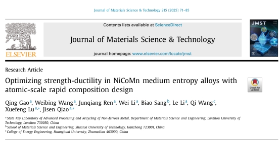 近期,省部共建有色金属先进加工与再利用国家重点实验室乔及森教授团队,卢学峰教授、任军强副研究员团队和黄淮学院王启副教授团队合作通过多尺度成分设计和实验验证在中熵合金领域取得了重要进展,并以题为“Optimizing strength-ductility in NiCoMn medium entropy alloys with atomic-scale rapid composition design”发表在材料科学领域TOP期刊《Journal of Materials Science & Technology》上(中科院一区,IF:11.2)。兰州理工大学省部共建有色金属先进加工与再利用国家重点实验室为第一完成单位,黄淮学院能源工程学院和陕西理工大学材料科学与工程学院为合作单位。博士研究生郜清为第一作者,乔及森教授和卢学峰教授为通讯作者。论文链接:https://doi.org/10.1016/j.jmst.2024.07.024。
