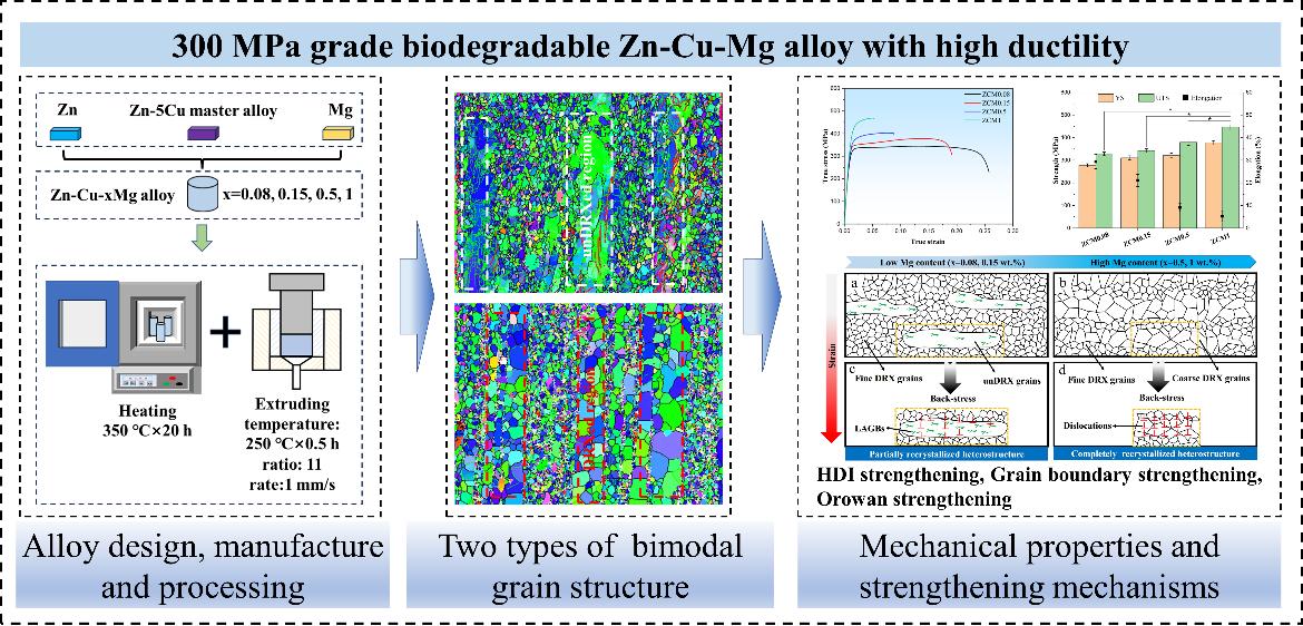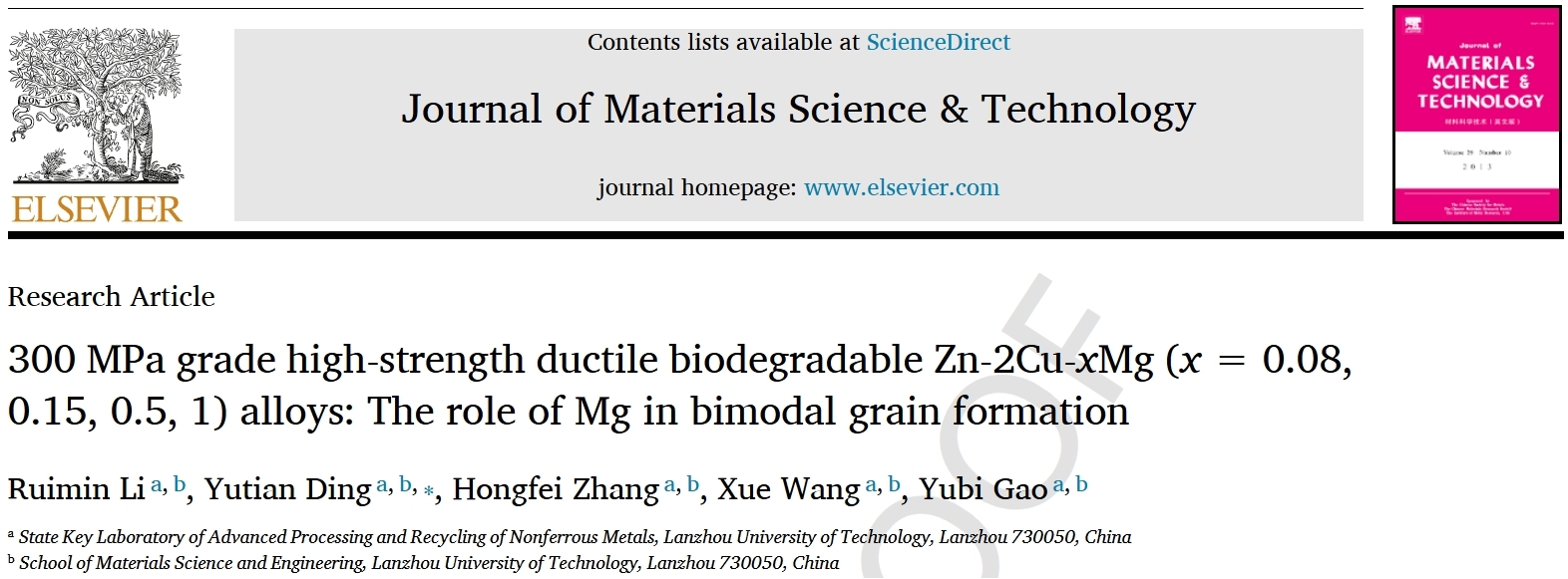 近期,省部共建有色金属先进加工与再利用国家重点实验室丁雨田教授团队在生物医用可降解锌基合金取得重要进展,并以题为“300 MPa grade high-strength ductile biodegradable Zn-2Cu-xMg (x=0.08, 0.15, 0.5, 1) alloys: The role of Mg in bimodal grain formation”发表在材料科学领域TOP期刊《Journal of Materials Science & Technology》上(中科院一区,IF:11.2)。兰州理工大学省部共建有色金属先进加工与再利用国家重点实验室作为独立完成单位;博士研究生李瑞民为第一作者,丁雨田教授为通讯作者。