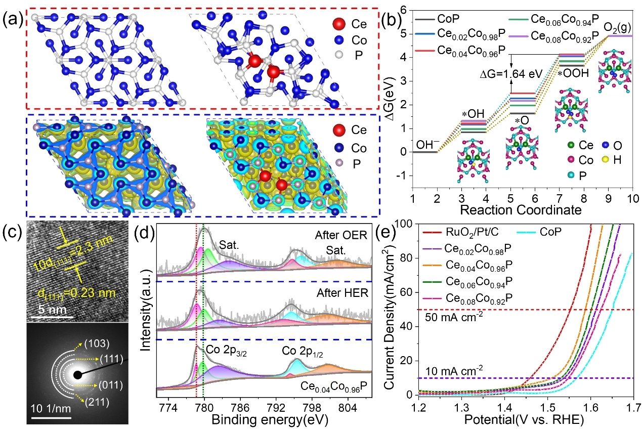 材料形貌的合理设计和环保电催化剂的选择对高效水分解至关重要。团队通过创新策略,将铈元素掺杂到磷化钴(CoP)中,有效调控了CoP的电子结构,大幅提升了其在水分解中的催化性能。研究结果表明,采用Ce-ZIF-67衍生的多孔Ce掺杂CoP微多面体作为电催化材料,能够在氢析出和氧析出反应中表现出极佳的催化活性和长期稳定性。在实验测试中,该材料在10 mA cm⁻²电流密度下实现氢析出反应的过电位仅为152 mV,氧析出反应的过电位则为352 mV。同时,采用该材料作为阴阳两极的碱性电解槽,在10 mA cm⁻²的电流密度下仅需1.55 V的电压。密度泛函理论(DFT)计算进一步揭示,铈元素的适量掺入不仅增强了CoP的导电性,还能够优化催化表面对反应中间体的吸附,从而实现优异的电催化效果。此项研究为设计高效水分解电催化剂开辟了新的方向,有望在未来清洁能源开发中发挥重要作用。