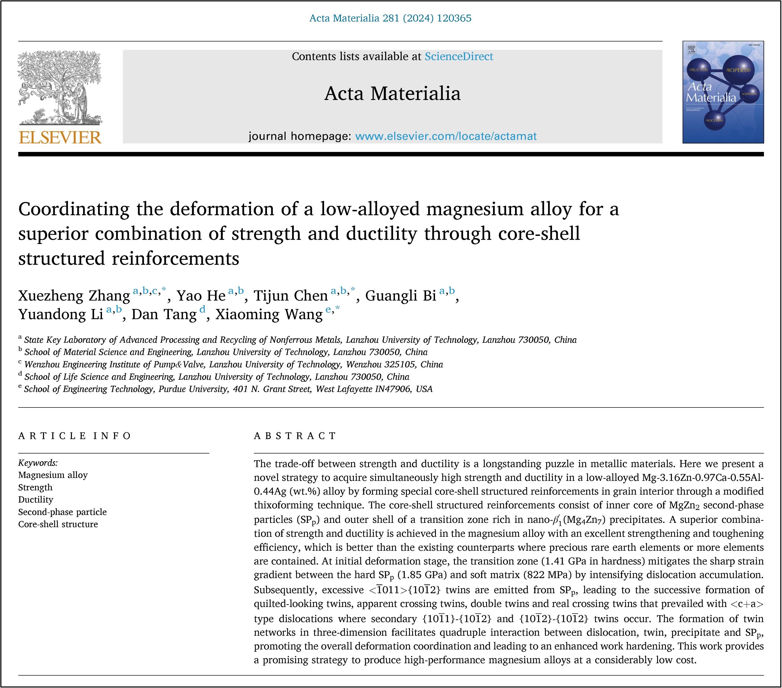 近日,兰州理工大学省部共建有色金属先进加工与再利用国家重点实验室轻金属团队在镁合金领域取得最新研究进展,以题“Coordinating the deformation of a low-alloyed magnesium alloy for a superior combination of strength and ductility through core-shell structured reinforcements”发表在国际著名材料类期刊《Acta Materialia》(中科院1区),兰州理工大学省部共建有色金属先进加工与再利用国家重点实验室为第一完成单位,张学拯副教授为第一作者,陈体军教授为共同通讯作者。
