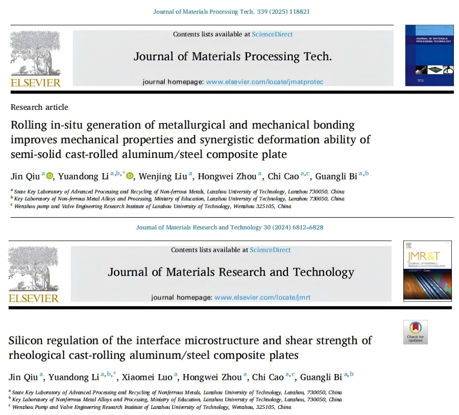 近日,实验室有色金属新材料先进成形与表面改性科研团队在高强度金属复合板方面取得重要进展,并以题为《Rolling in-situ generation of metallurgical and mechanical bonding improves mechanical properties and synergistic deformation ability of semi-solid cast-rolled aluminum/steel composite plate》、《Silicon regulation of the interface microstructure and shear strength of rheological cast-rolling aluminum/steel composite plates》分别发表在国际著名期刊《Journal of Materials Processing Tech.》(中科院一区Top期刊,JCR一区,IF=6.7)以及《Journal of Materials Research and Technology》(中科院二区Top期刊,JCR一区,IF=6.2)上,2020级博士邱谨为第一作者、李元东教授为通讯作者。并获授权国家发明专利1项,该进展为新能源装备、交通等领域的轻量化设计提供了关键技术支撑。