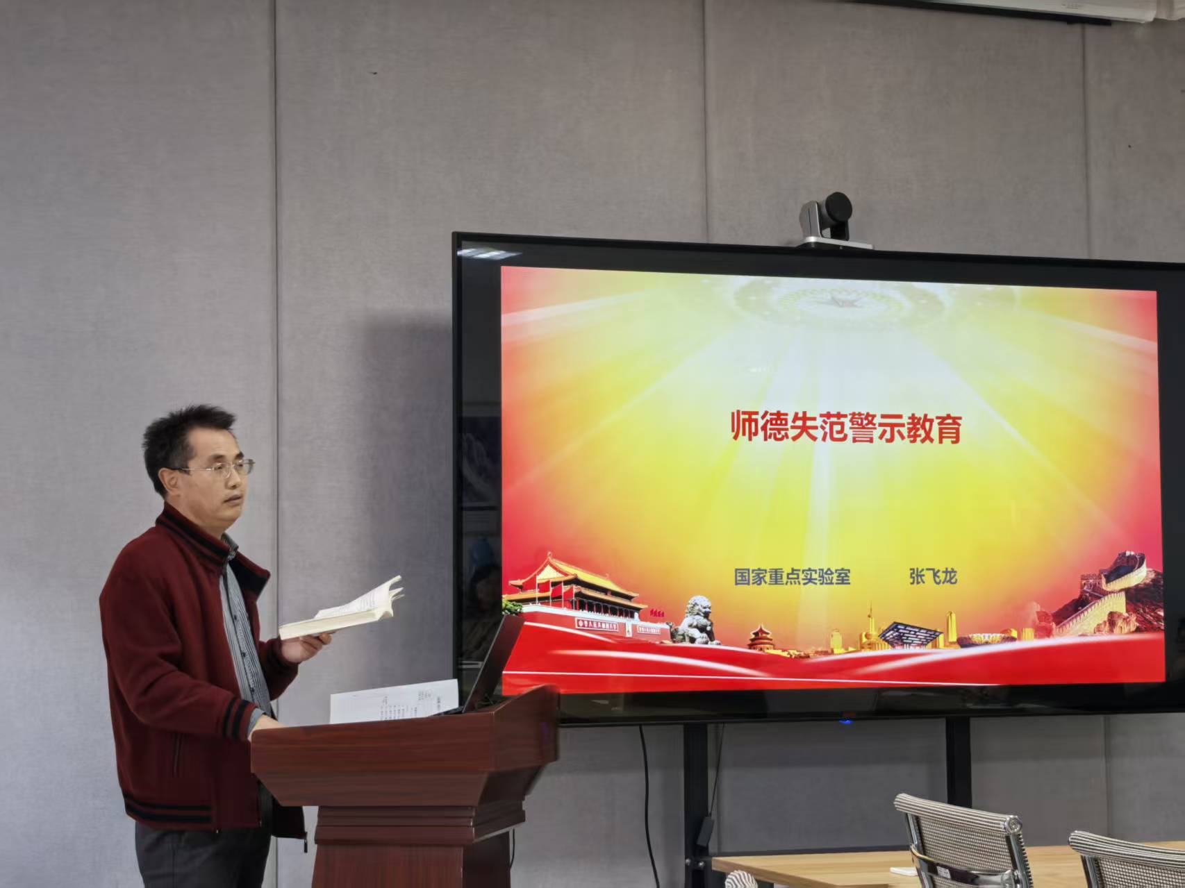 在师德师风警示教育环节,张飞龙带领全体教师认真学习了教育部等七部门联合印发的《关于加强和改进新时代师德师风建设的意见》,要求全体教职工严守师德底线,筑牢思想防线。结合违反教师职业行为十项准则的典型案例,他进一步强调,实验室全体教师要坚定理想信念、厚植爱国情怀、涵养高尚师德,始终牢记为党育人、为国育才的初心使命,以崇高师风和扎实业绩投身于教育科研事业。(图/文:周宏伟,审核:张飞龙)