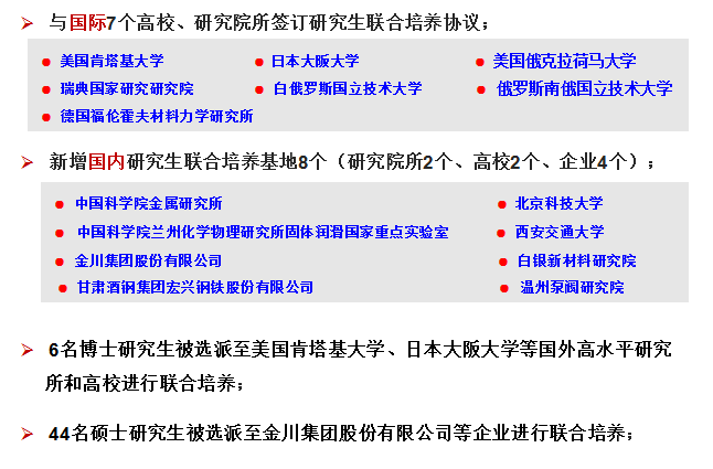 2013~2017年,累计培养博士研究生26人,培养硕士研究生516人,其中5名博士研究生的学位论文入选了甘肃省优秀博士学位论文。6名博士研究生被选派至美国肯塔基大学、日本大阪大学等国外高水平研究所和高校进行联合培养。