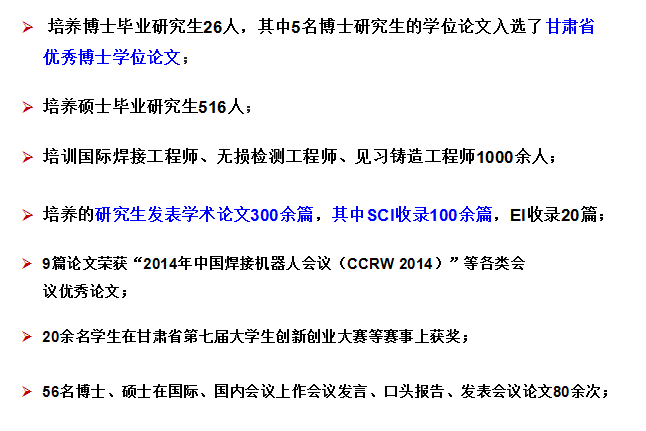 同时,重点实验室还积极发挥科研平台的作用,大力推进教育教学改革,积极拓展焊接专业国际焊接工程师培训、无损检测工程师培训、见习铸造工程师培训,2015年“学历教育与国际焊接工程师资质认证相结合的创新人才培养体系及实践”项目获得甘肃省教育厅厅级奖并被推荐参加省级教学成果奖评选,同年,重点实验室被IIW国际焊接学会授予“突出贡献二等奖”。无损检测资格证书由欧盟通用升级为国际通用。累计培养学生1000余人。